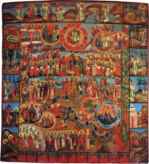 На американской иконе мы также видим деисусную композицию, вершащего суд Христа в окружении апостолов, молящихся Адама и Еву, руку Господнюю с весами (в центре) и Сатану, держащего на коленях Иуду Искариота с мешком серебрянников (в огнях пламени в правом нижнем углу). На клинтоновской иконе Сатана имеет крылья. Он восседает верхом на сказочном рогатом и крылатом животном, навеянном, возможно, Книгой Даниила. Новым также является выползающий из пламени и направляющийся к центру картины змей («червь») с двадцатью утолщениями на теле. Эти утолщения символизируют «двадцать мытарств», на основе которых Христос будет судить людей. Каждое из них подписано на славянском языке.